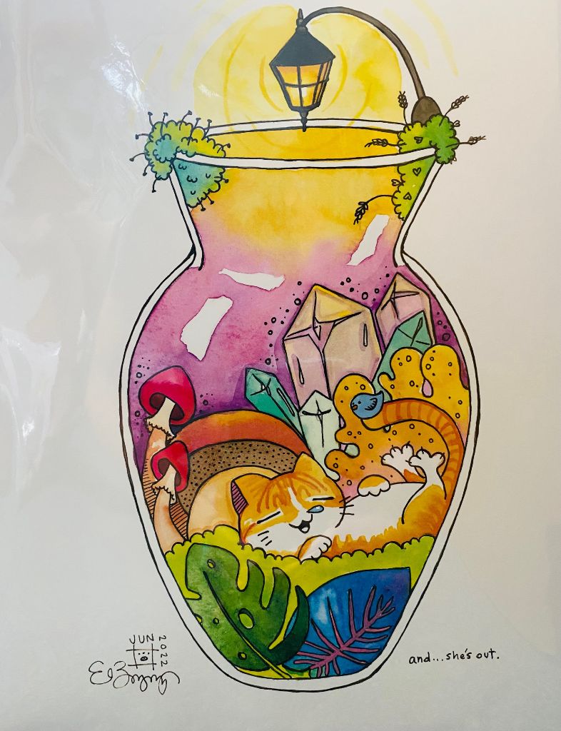 "And, she's out" is a 9x12 watercolor and pen print of Carrots, the other guardian of Coffee Creek Community Gardens and Farm.