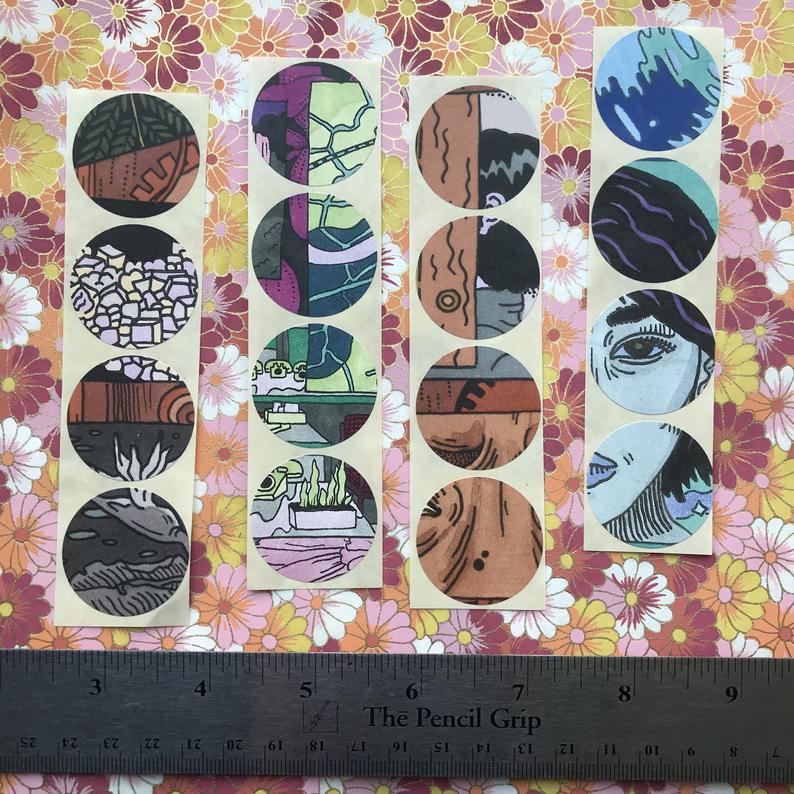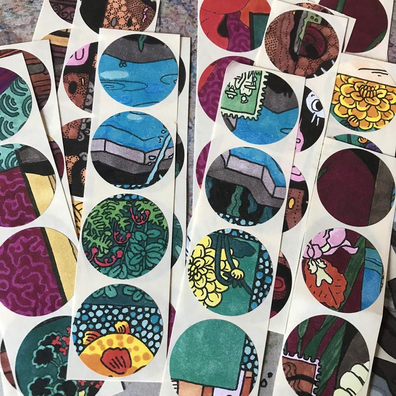 Ta- Da! CIRCLES!! Recently got my hands on some old sheets of one-inch circle sticker-paper sheets, and printed some of my recent colorful collage-drawings on them!!
