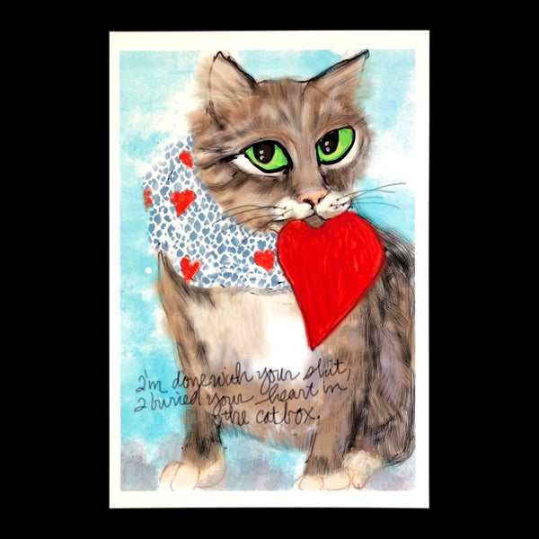 "I'm done with your shit, I buried your heart in the catbox." 4" x 6" postcard
