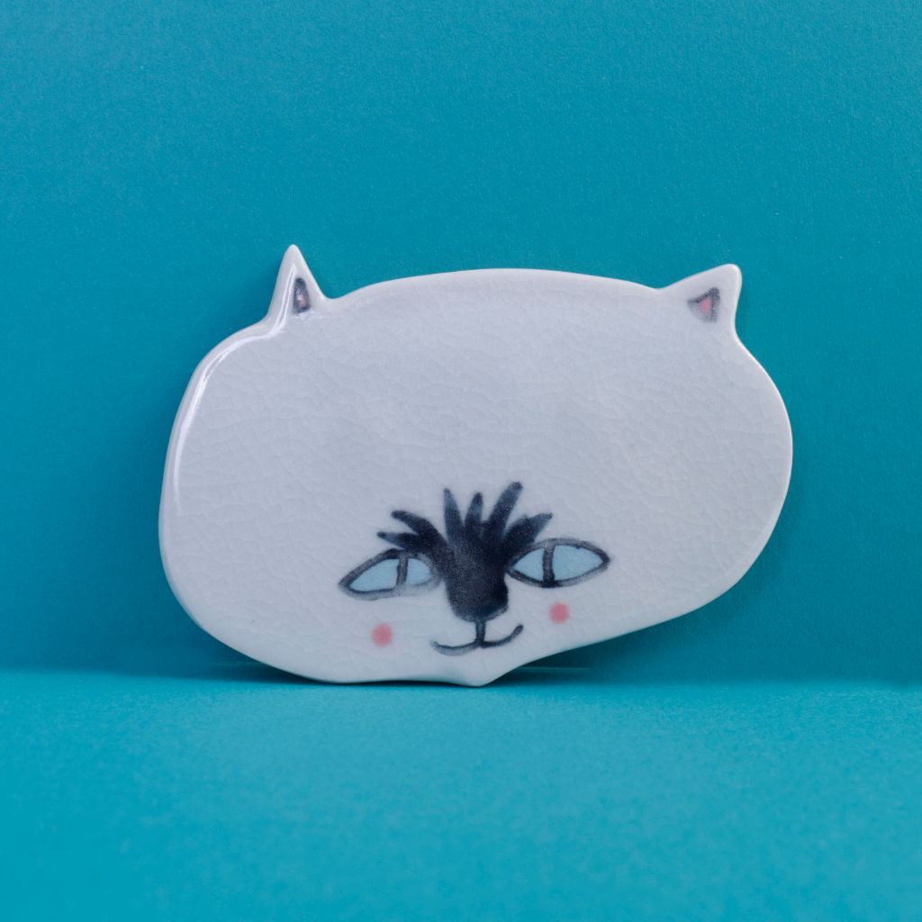 Ceramic cat face to brighten up your room. Kitty is approx. 4" x 3" and is meant to be leaned on something or laid flat. Not made for hanging.