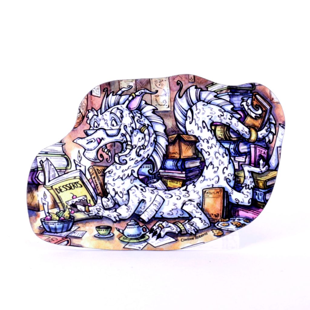 Fantasy dragon in library reading a book of desserts magnet from original drawing by Corinne Roberts. 3" wide x 2" high.