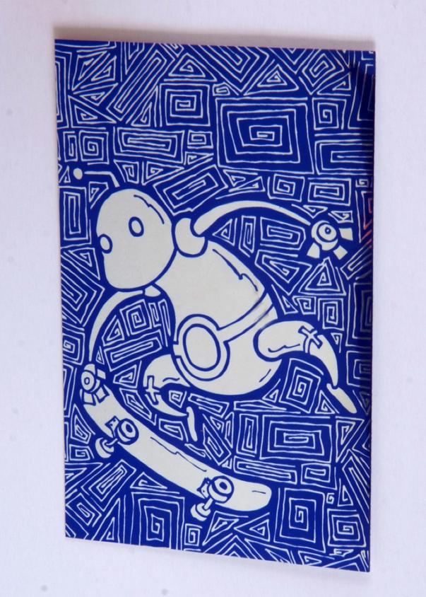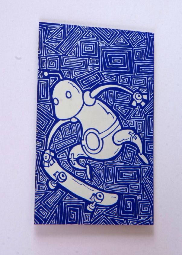 Foil robot with a skateboard sticker by P. Calavara. Approx. 4 1/4" x 2 1/2".