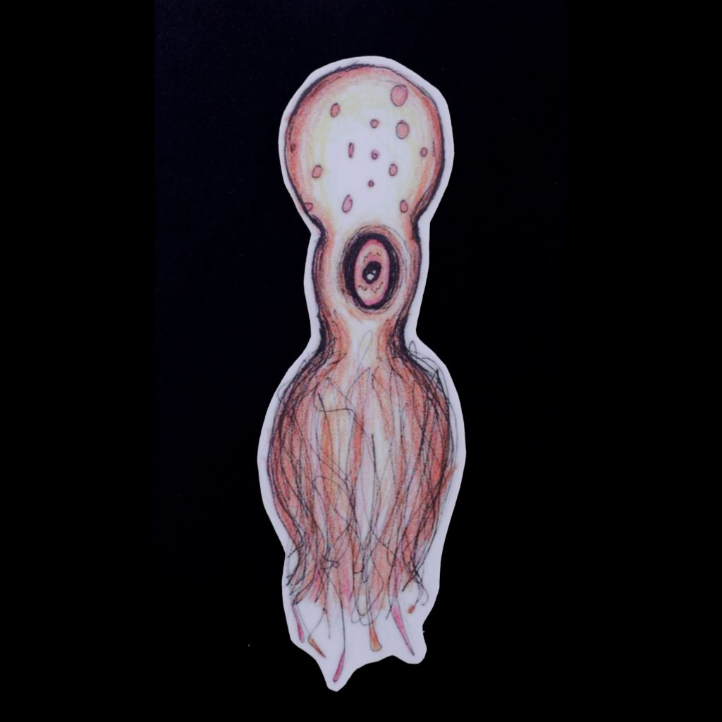 Fun, creepy, marine life squid vinyl sticker made with colored pencil & ink. 4 1/2" tall.