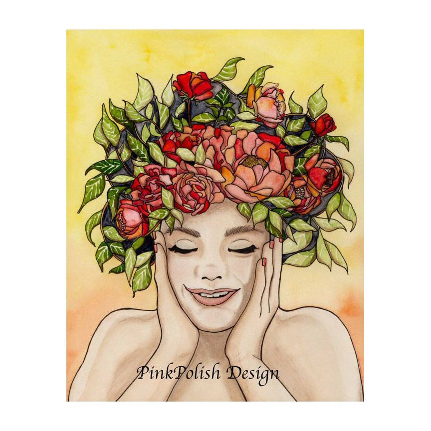 Giddy - 8" x 10" art print of a lady with a floral headdress from an original ink and watercolor painting, numbered and signed with a print certificate. Watermark does not appear on print.