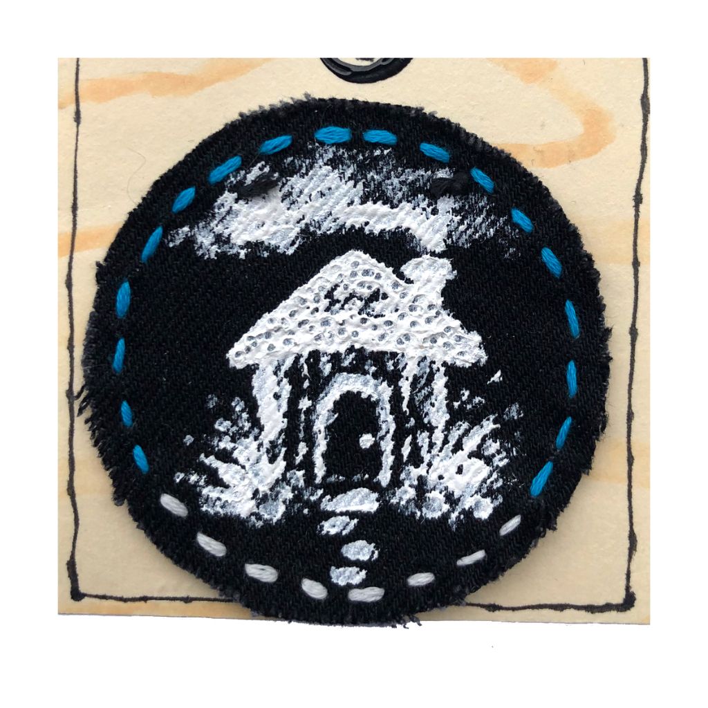 A small house on a hill. This sew-on patch is hand-painted and embroidered on upcycled denim. For a no-sew alternative, you can apply iron-on backing. Patches are also great for framing!