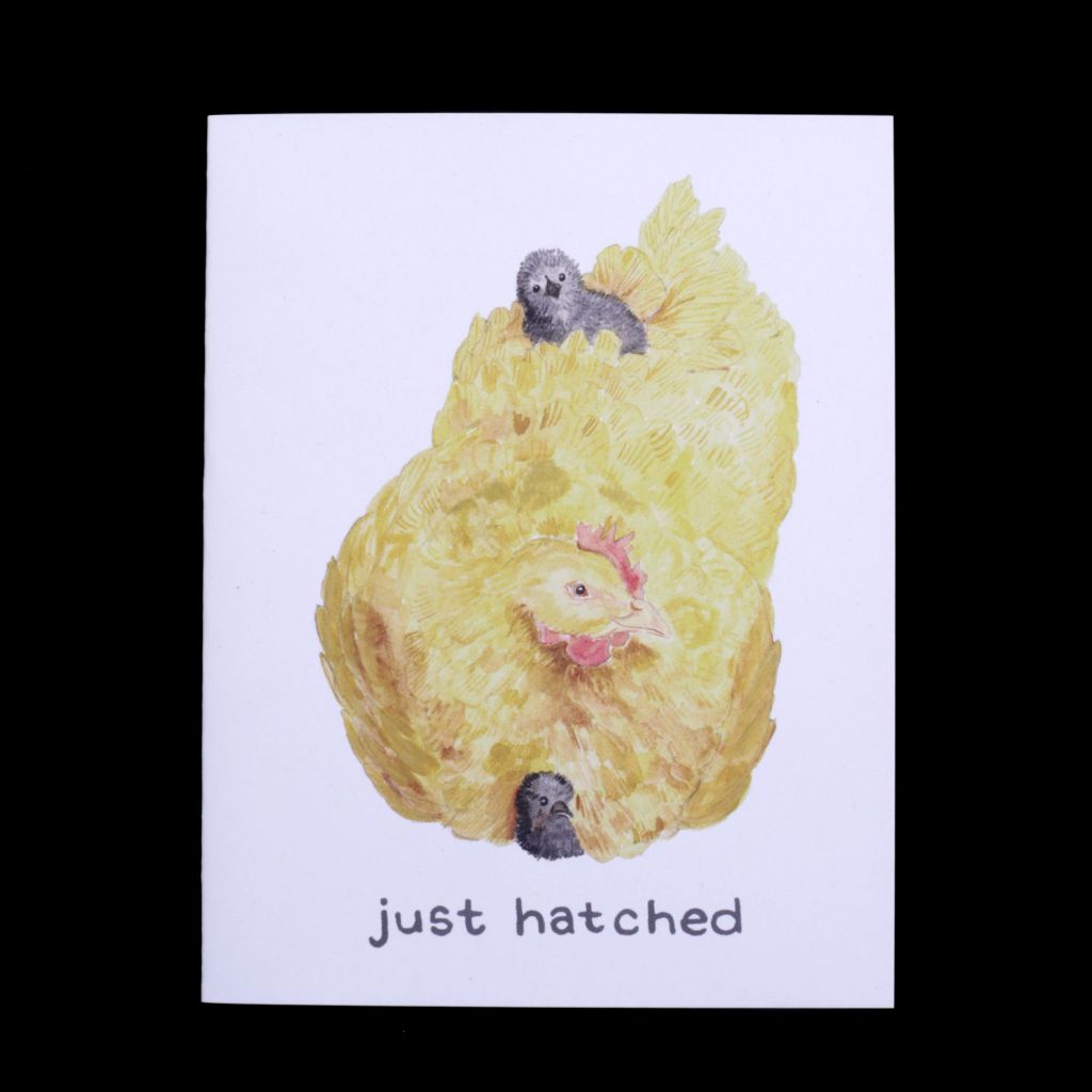 The Just Hatched baby card features a watercolor illustration of the artist's own backyard hen and chicks.