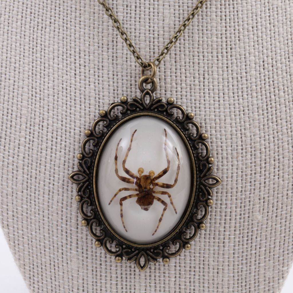 This is a real brown house spider / ghost spider specimen that's been encapsulated inside a clear resin cabochon with white back. Pendant is 2 1/4" long x 1 3/4" wide. 18" Brass colored chain with a lobster clasp.