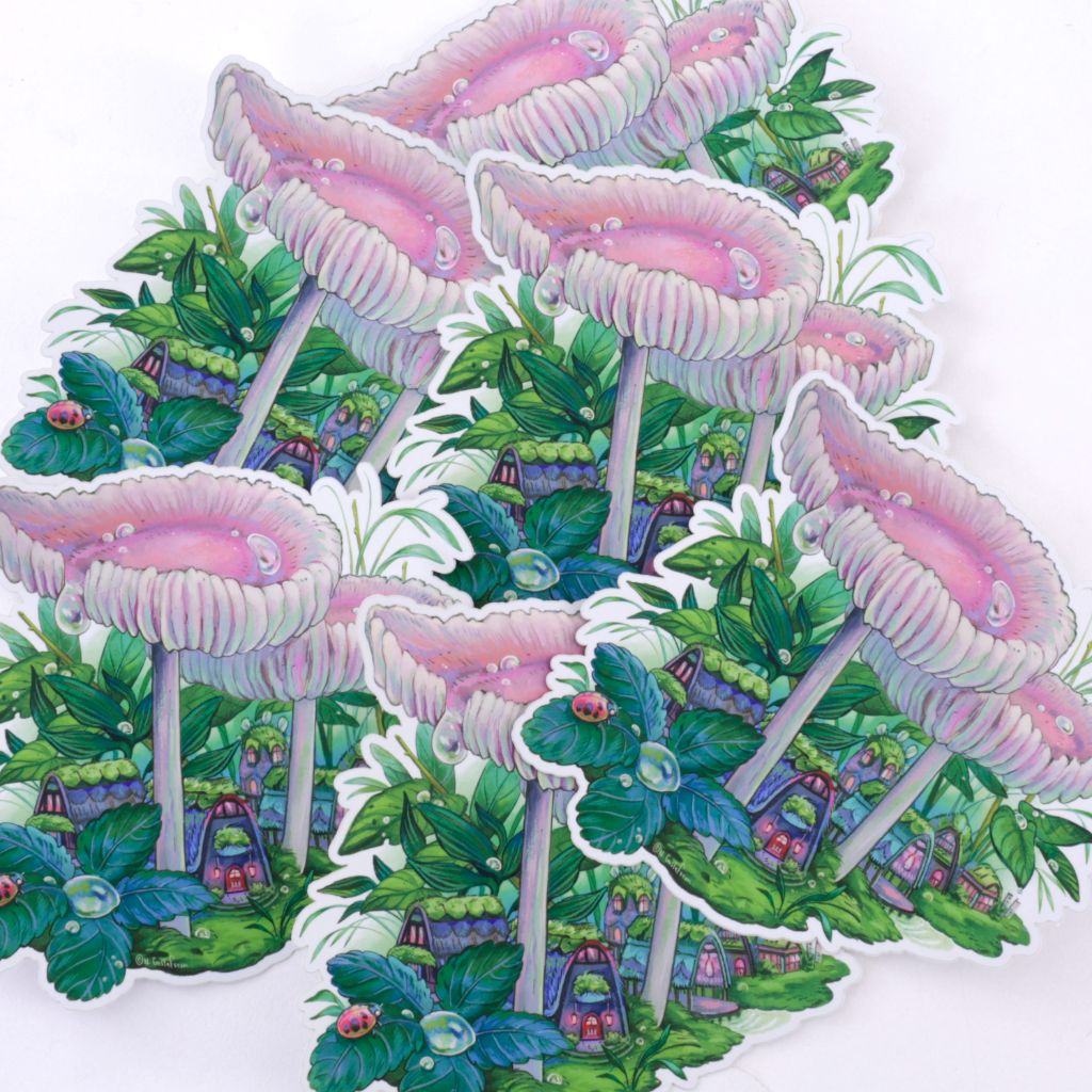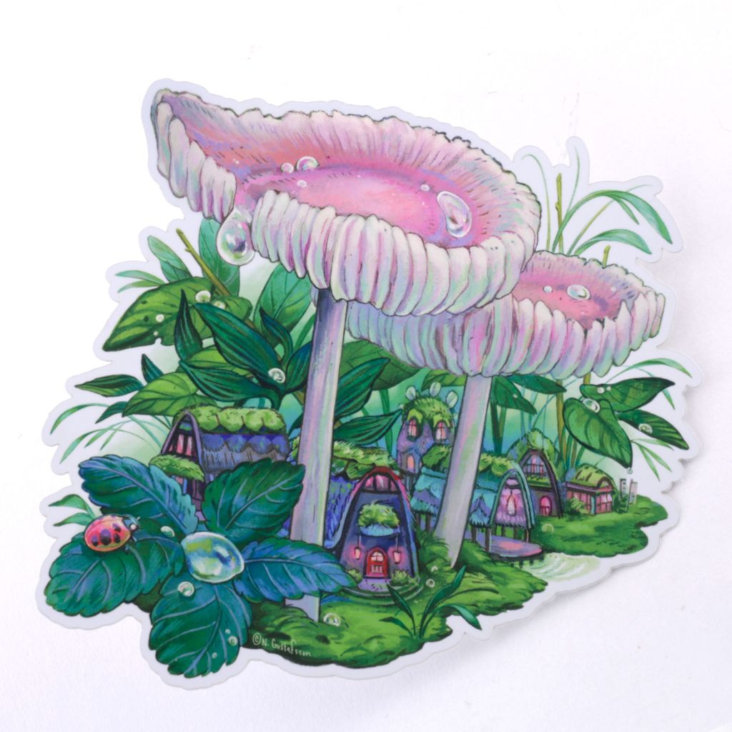Single vinyl sticker features little houses nestled under mushrooms, dewdrops and ladybug.