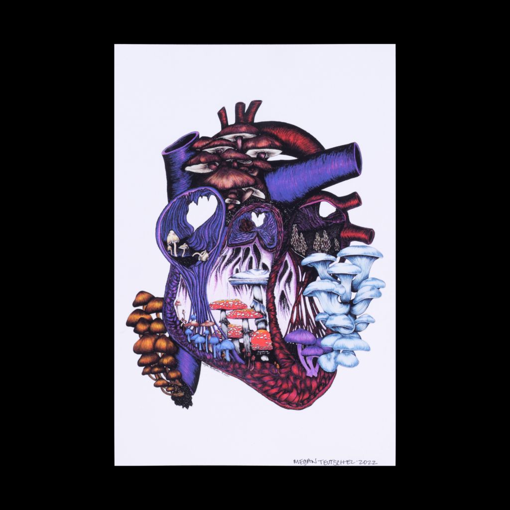 "Mushroom Heart" color print of an original ink by Megan Teutschel. Printed on heavy white paper - 6" x 9"