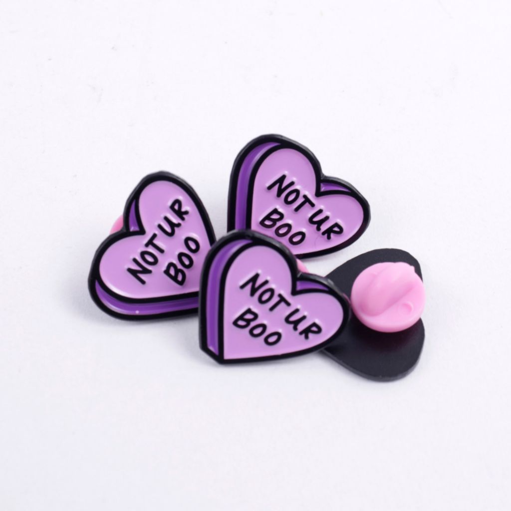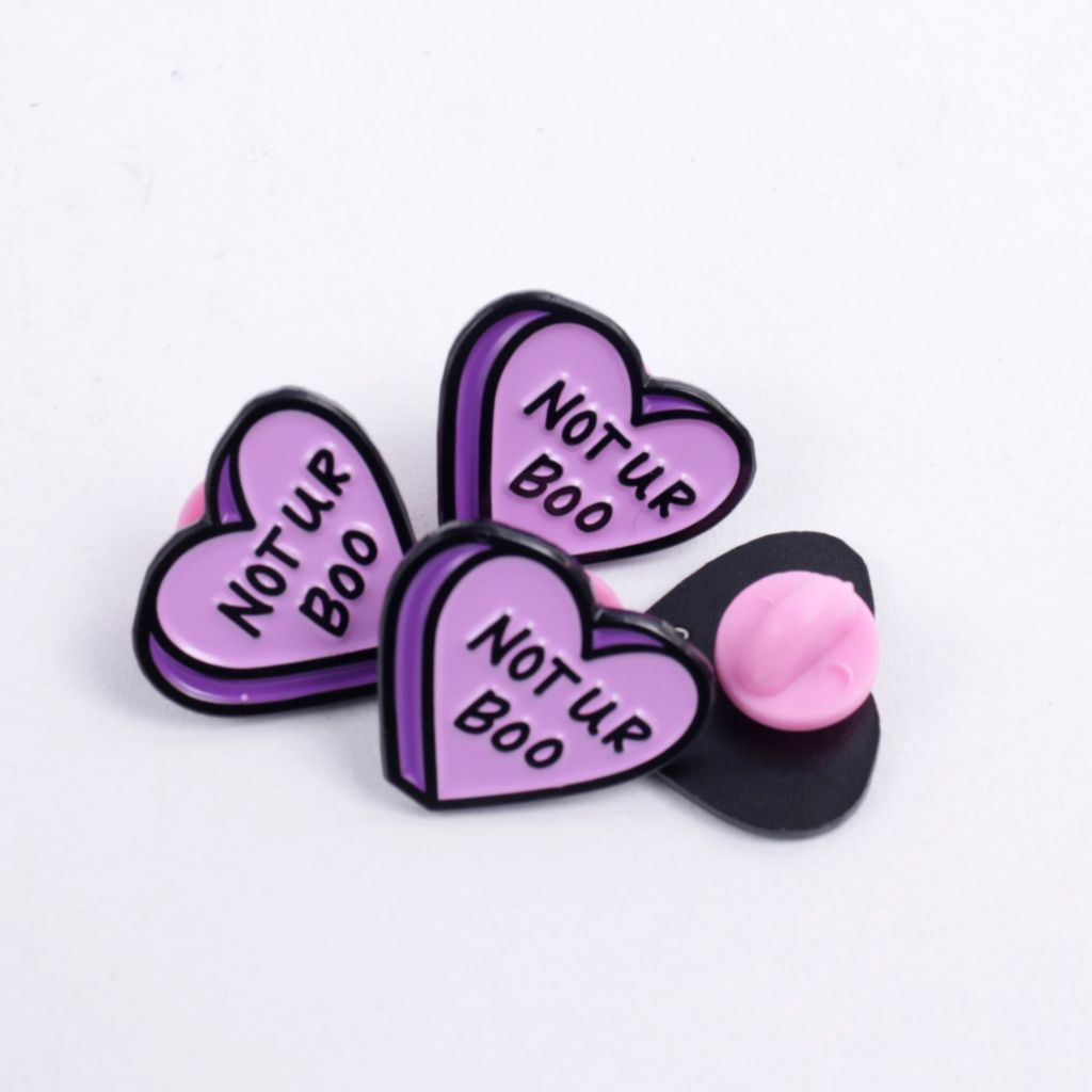"Not Ur Boo" tie tack pin. Purple, pink and black heart. Approx. 3/4" tall.