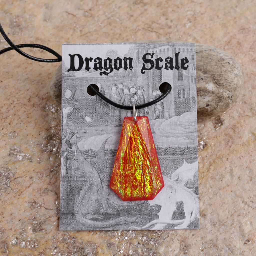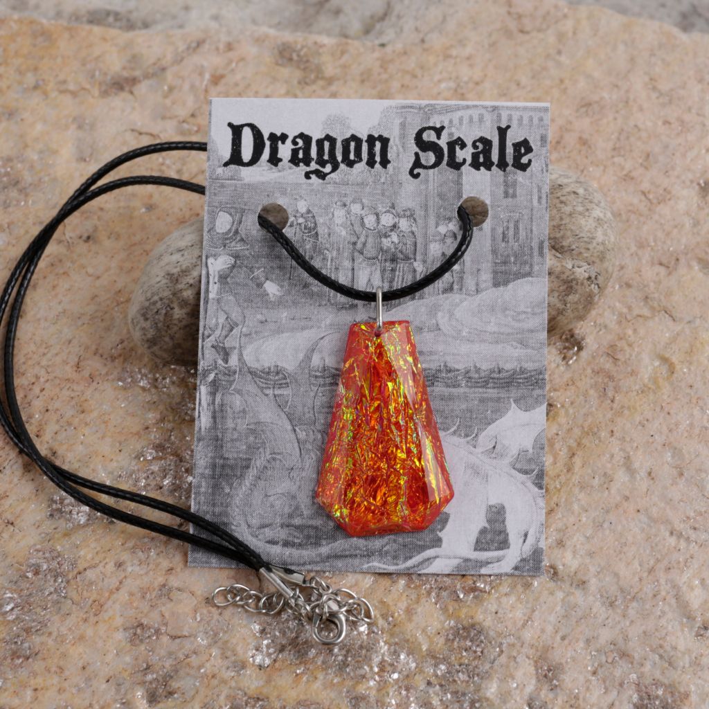 Orange dragon scale pendant made with resin and backed with foil. Mounted on an 18" black cord with a lobster clasp. Pendant is approx. 1 1/2" long x 1" (at the widest point).