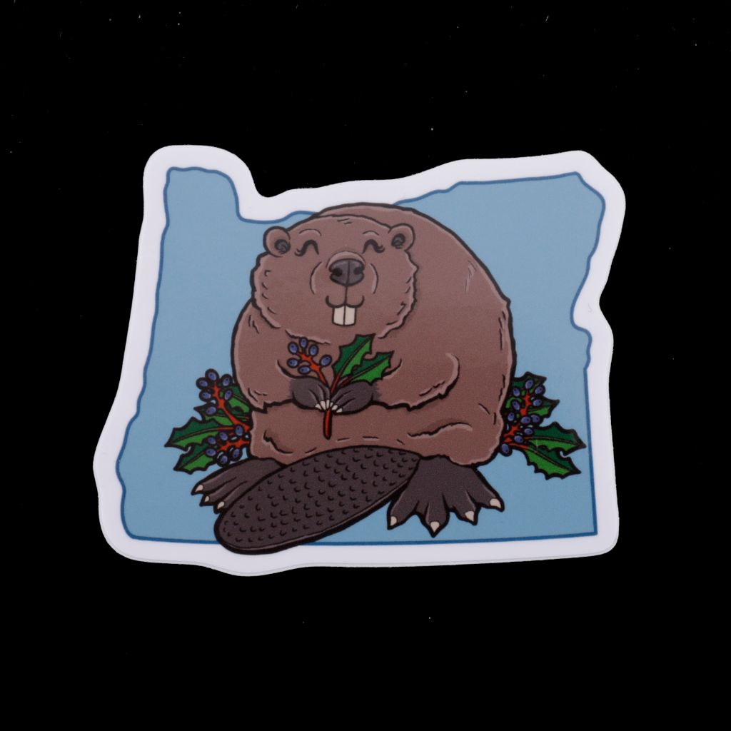 Glossy 3 x 2.5 inch vinyl sticker featuring my illustration of the official Oregon State animal and flower: the Beaver and Oregon grape.