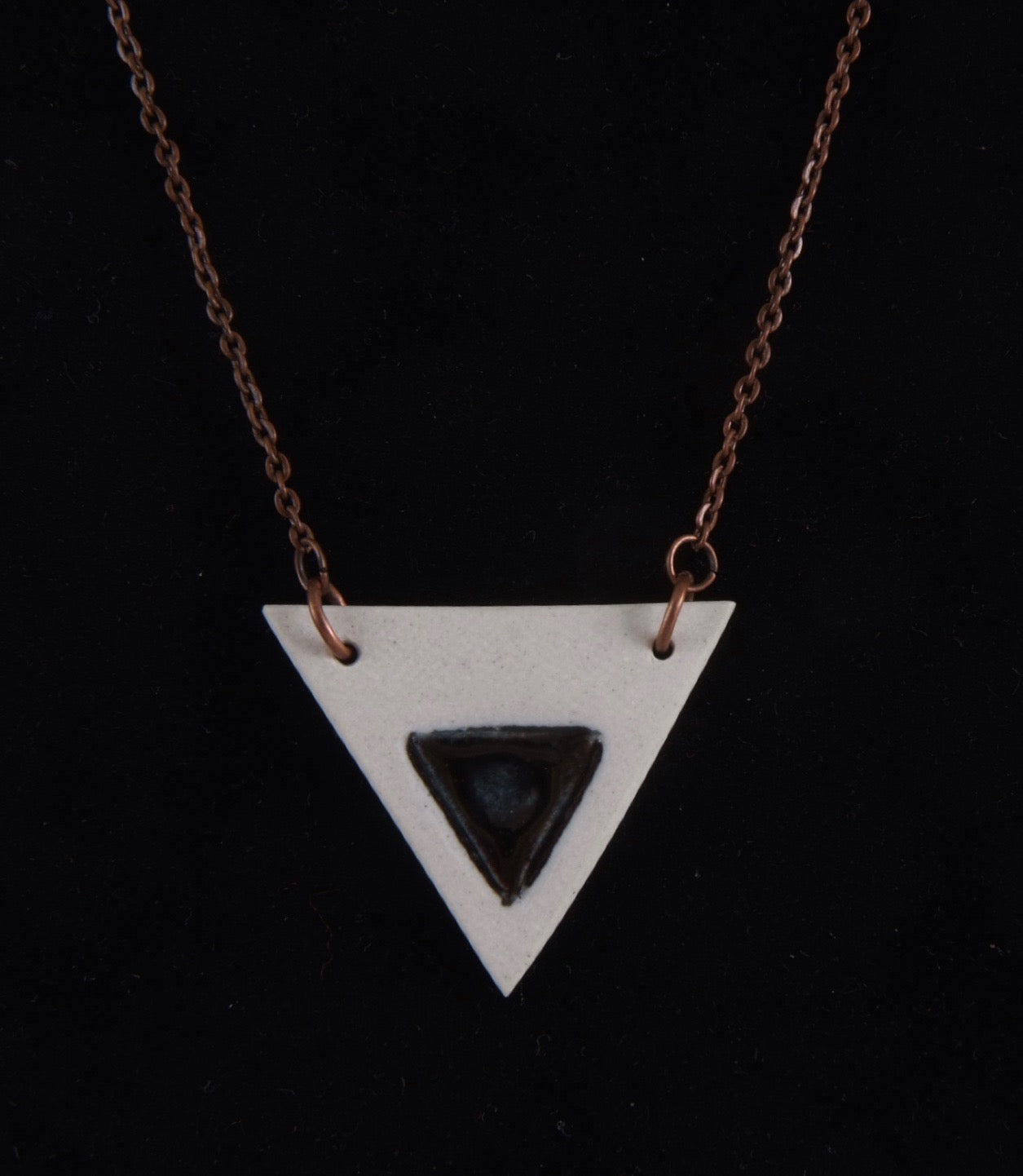Elegant triangle shaped porcelain / ceramic pendant with a black design. Approx. 1 3/4" wide x 1 3/8" tall with a 30" brass colored chain.