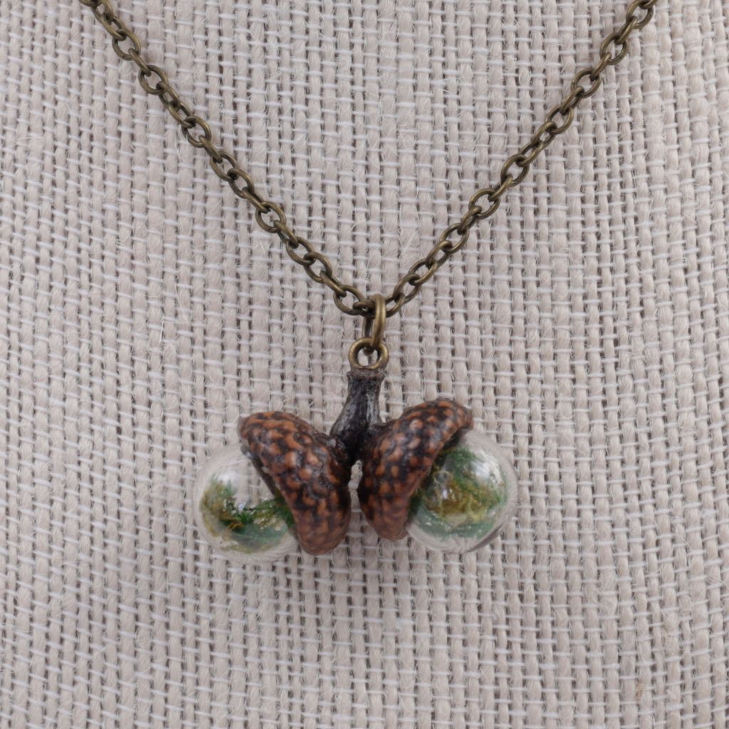Real acorn caps with glass dome filled with moss from the Pacific NW. Pendant is 1 1/4" wide, mounted on a brass 18" chain with a lobster clasp.