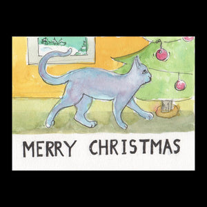 "Russian Blue" Original watercolor postcard featuring a Russian Blue cat ready for Christmas. 5" x 7" on watercolor cardstock with printed postcard ready back.