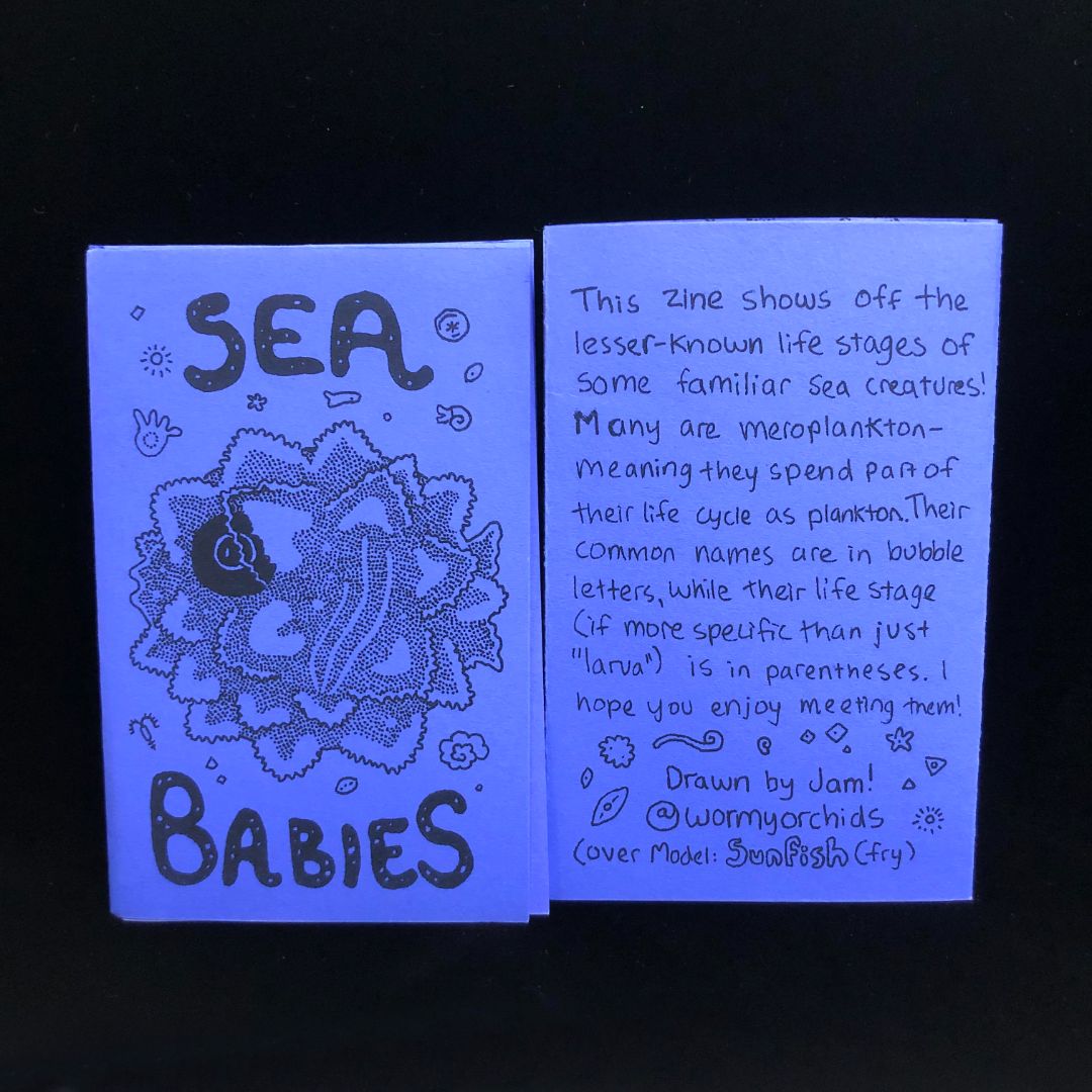 This black and white minizine shows the lesser known life stages of some familiar sea creatures!! Many marine animals spend part of their life cycle as members of the plankton, free floating, tiny, and usually transparent organisms in the water column. Their common names are written in bubble letters, and their larval stage (if more descriptive than just larva”) is in parentheses.