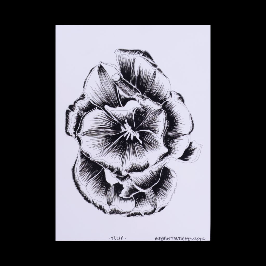 "Tulip" black & white botanical print of an original ink by Megan Teutschel. Printed on heavy white paper - 5" x 7"