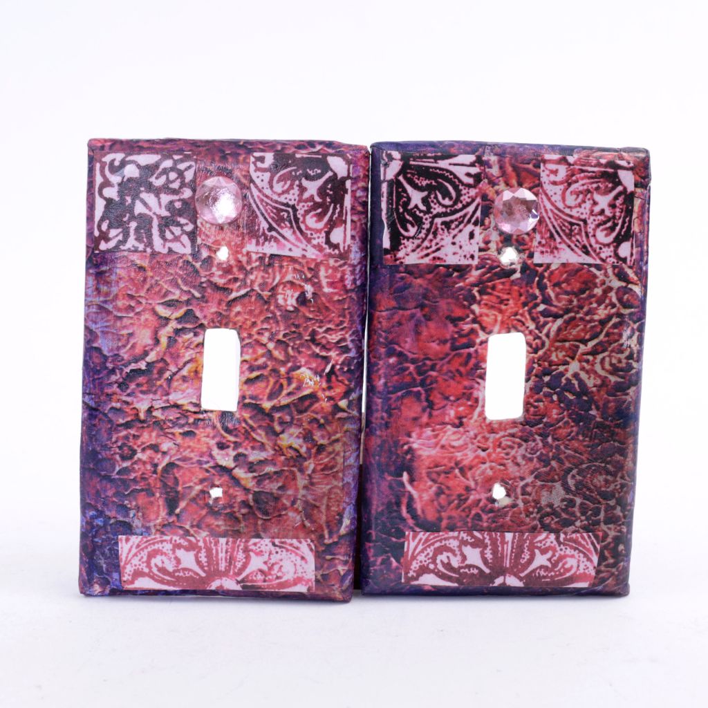 Set of 2 light switch plate covers. Collaged with handmade paper, stamped and each is enhanced with a gemstone. Complete with matching screws. Fits a standard light switch - 4 1/2" x 2 3/4".