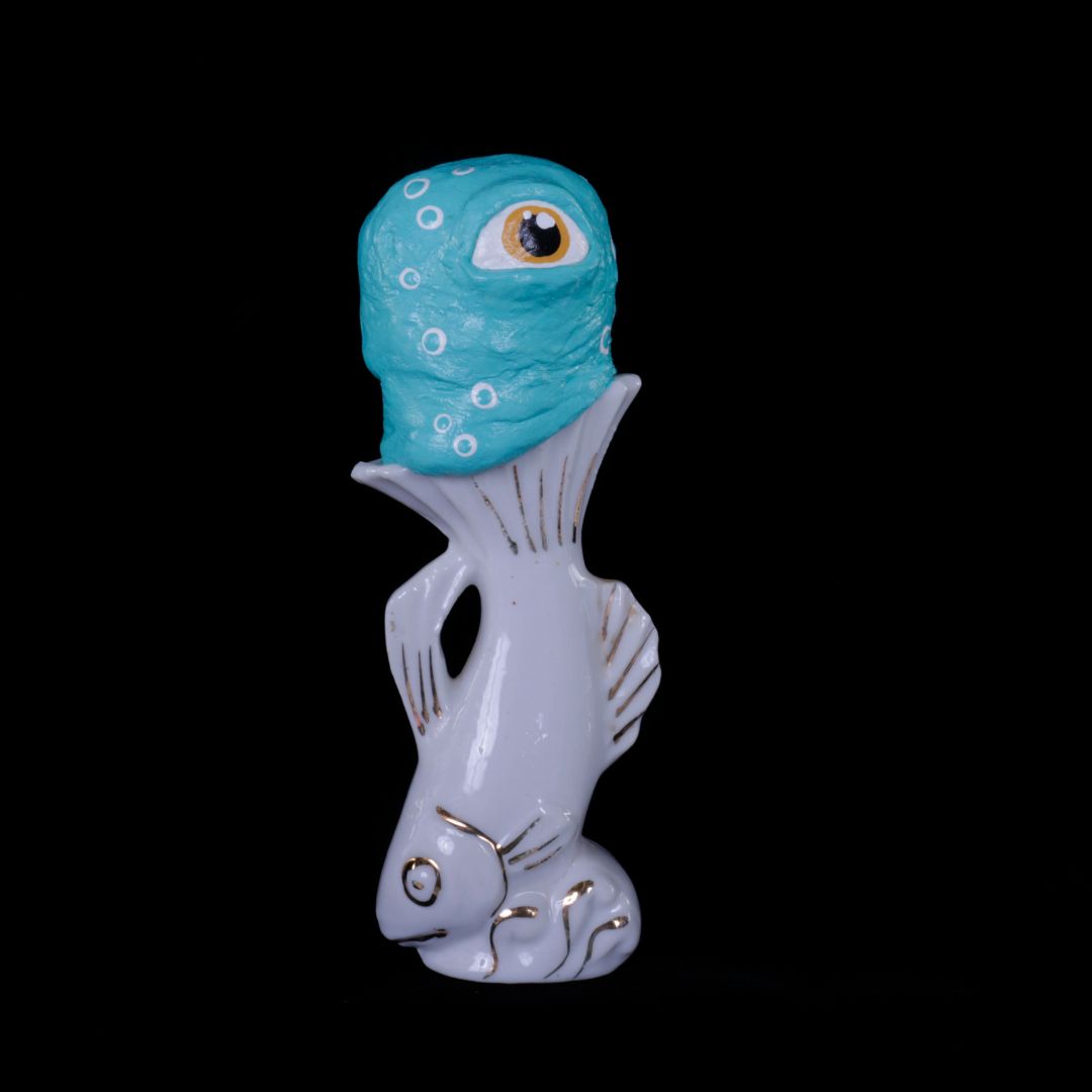 Friendly little aliens that crashed into Oktober's Attic. They didn't know they were supposed to use furniture, so they plopped themselves into all of Grandma's tchotchkes. Kattywamples are made with paper clay, acrylic paint, upcycled ceramic or metal bases. 5.5" tall x 2" wide x 1.75"